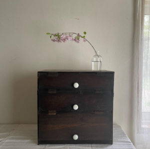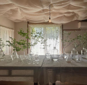 北広島市「m-flower」さんのドウダンツツジとかくれ家にある古物の瓶をフラワーベースにしたセット販売となります